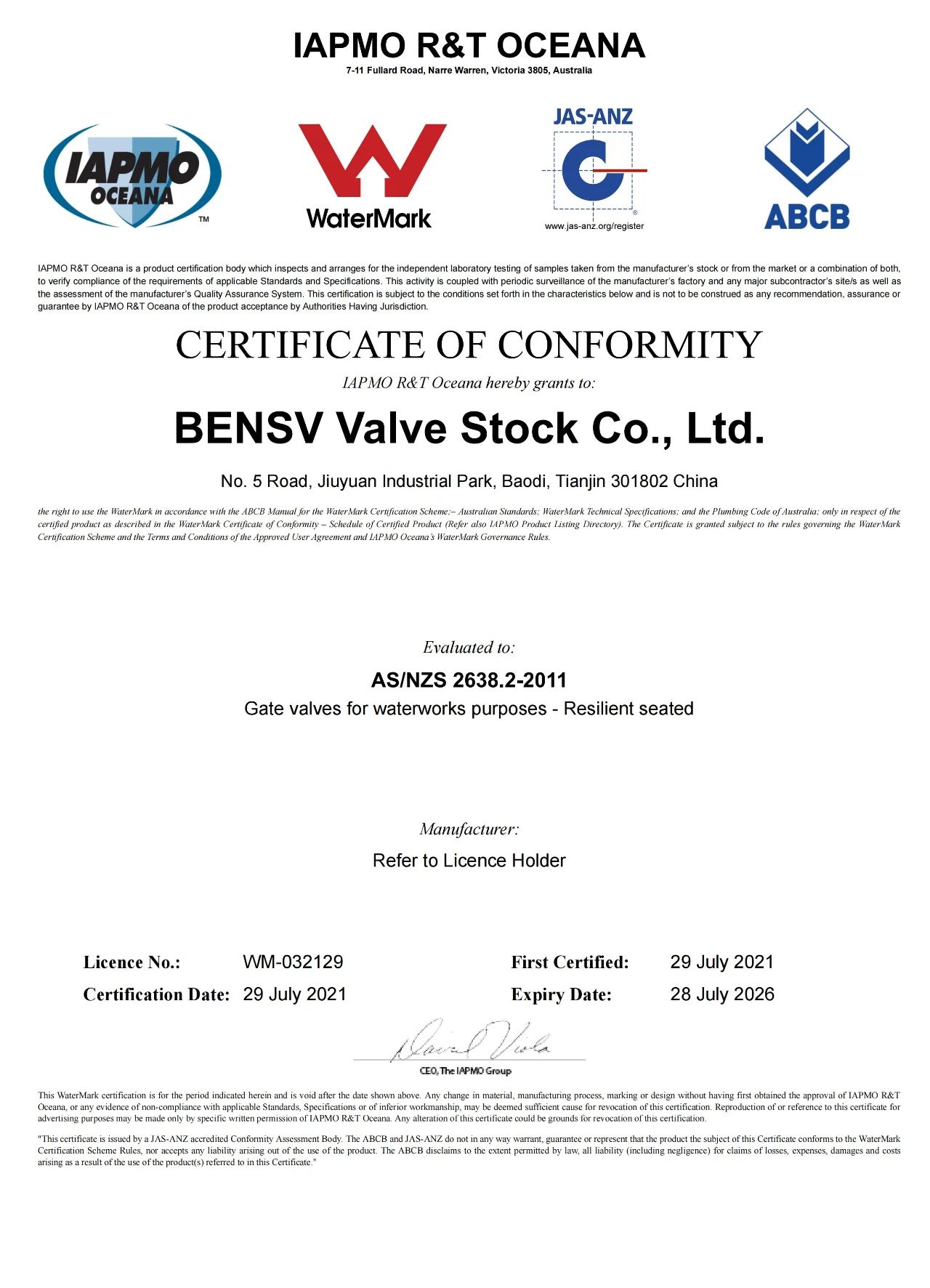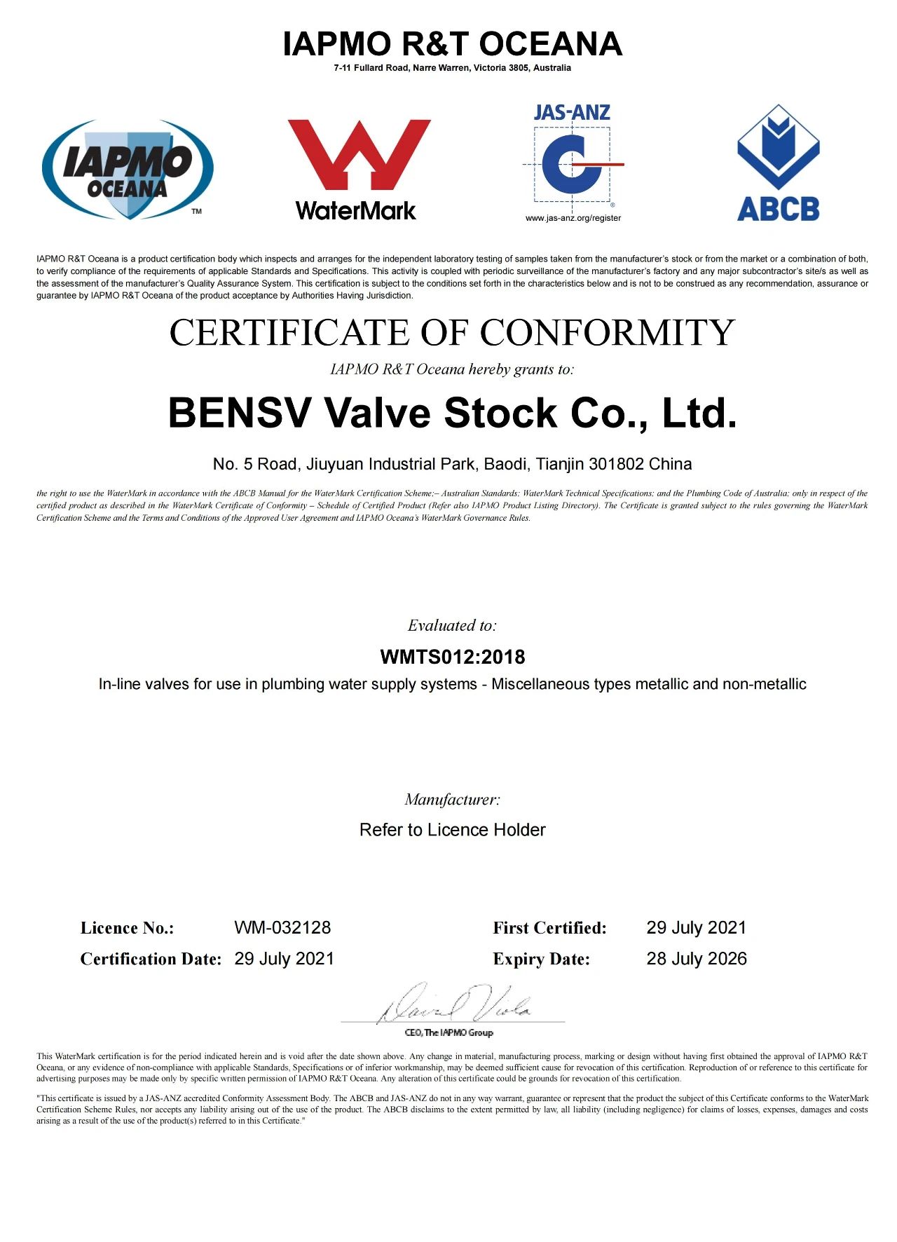 經過澳大利亞授權的WaterMark認證機構嚴苛檢測和嚴格評審后,博納斯威閥門獲得澳大利亞WaterMark飲用水產品認證。