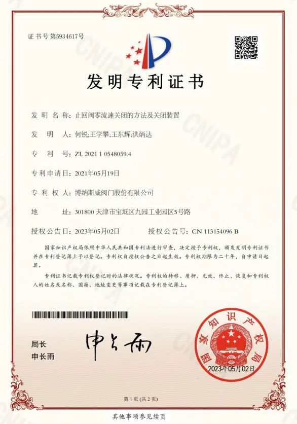 博納斯威閥門股份有限公司持續(xù)創(chuàng)新,2023年5月2日,博納斯威原創(chuàng)新技術(shù)“止回閥零流速關(guān)閉的方法及裝置”獲得國(guó)家知識(shí)產(chǎn)權(quán)局授權(quán)發(fā)明專利。迄今為止,博納斯威獲得專利總數(shù)量達(dá)到250項(xiàng),其中發(fā)明專利16項(xiàng),實(shí)用新型專利171項(xiàng),外觀專利63項(xiàng),成為專利高產(chǎn)閥門企業(yè)。