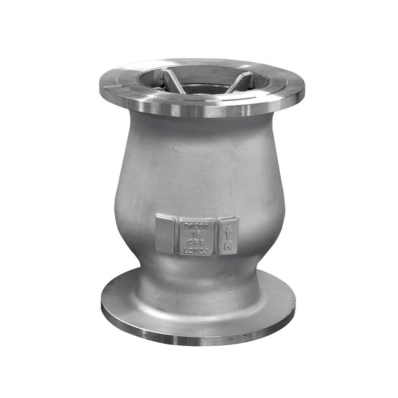 該閥的結(jié)構(gòu)特征如圖所示。該閥的主要特點(diǎn)是在閥門出口端安裝了一個(gè)導(dǎo)流體。當(dāng)介質(zhì)從進(jìn)口進(jìn)入后,托起閥瓣流向出口。當(dāng)介質(zhì)停止進(jìn)入時(shí),出口管道內(nèi)的介質(zhì)必然急速回流。由于導(dǎo)流體的作用,回流的介質(zhì)順著導(dǎo)流體的外表面和閥體的內(nèi)表面滑向進(jìn)口,使倒流的介質(zhì)不直接作用在閥瓣的大端面上,從而避免倒流介質(zhì)對(duì)閥瓣的沖擊,避免了水錘的產(chǎn)生,從而達(dá)到靜音的效果。